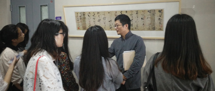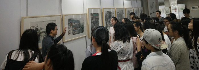 在“新吴门画派”作品展览的现场,吴伟老师首先为大家详细介绍了“吴门画派”的艺术特征,结合展览的作品,着重从作品的形式、内容及笔墨承载的文化精神的角度,分析了“新吴门画派”与“吴门画派”之间的传承关系。之后,在同学们欣赏作品的过程中,他随机为同学们答疑解惑,引导大家体会画家用笔、用墨的技巧,理解笔墨之中所蕴含的独特的美学意味和人文情怀。
