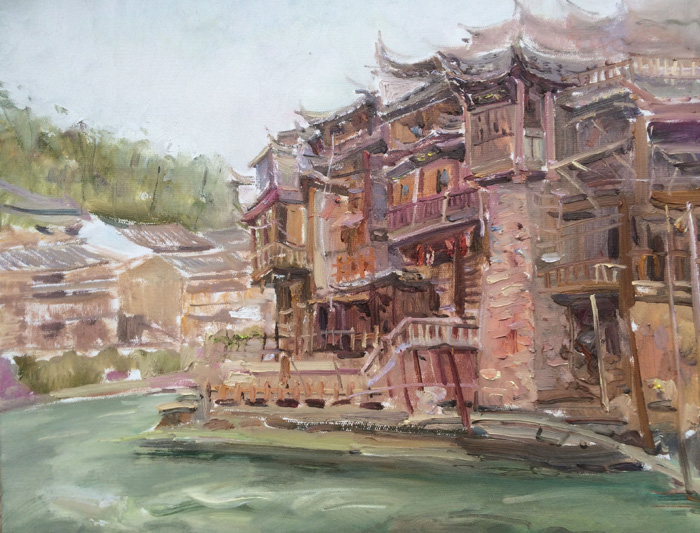 凤凰之美,美在山清水秀、美在人杰地灵、美在天人合一。她的钟灵毓秀蕴育着朴实灵气的苗族、土家族等风情浓郁的少数民族。此时的凤凰时值秋色初染,那里山川秀丽,人文荟萃,对江风海韵气息里成长的艺术学子而言是一种纯真之美的自然课堂,风景写生更亦遵循“师法自然”之道,师生们对景写生,用手中的画笔和相机搜集心中的风景。员工白天辛苦作画,晚间老师精心评讲,员工收获匪浅。期间,师生们还一起到周边原生态的德夯苗寨、西江千户苗寨搜集创作素材,苗寨的那些飞檐翘角的吊脚楼连成一排,蔚为壮观,而山间鸟声啾啾、傍晚的炊烟袅袅的意境更是让艺术学子们流连忘返。