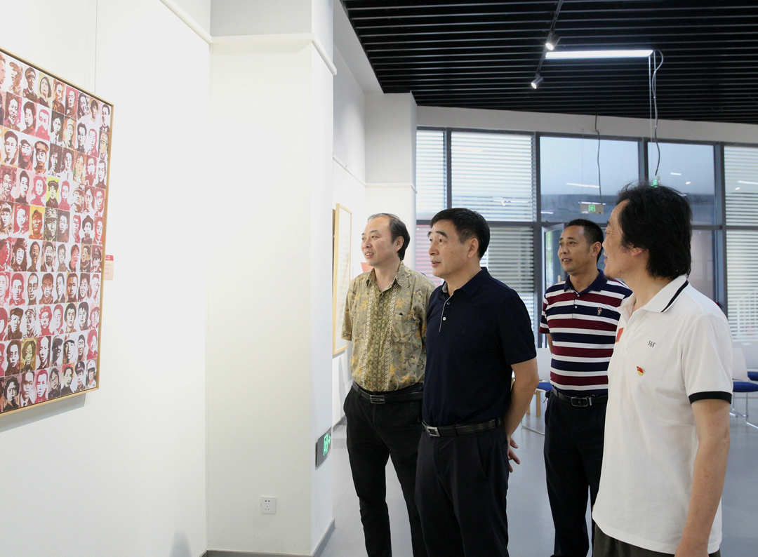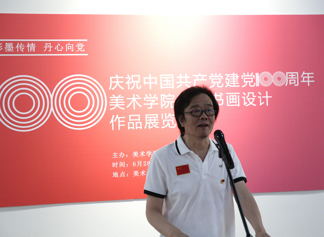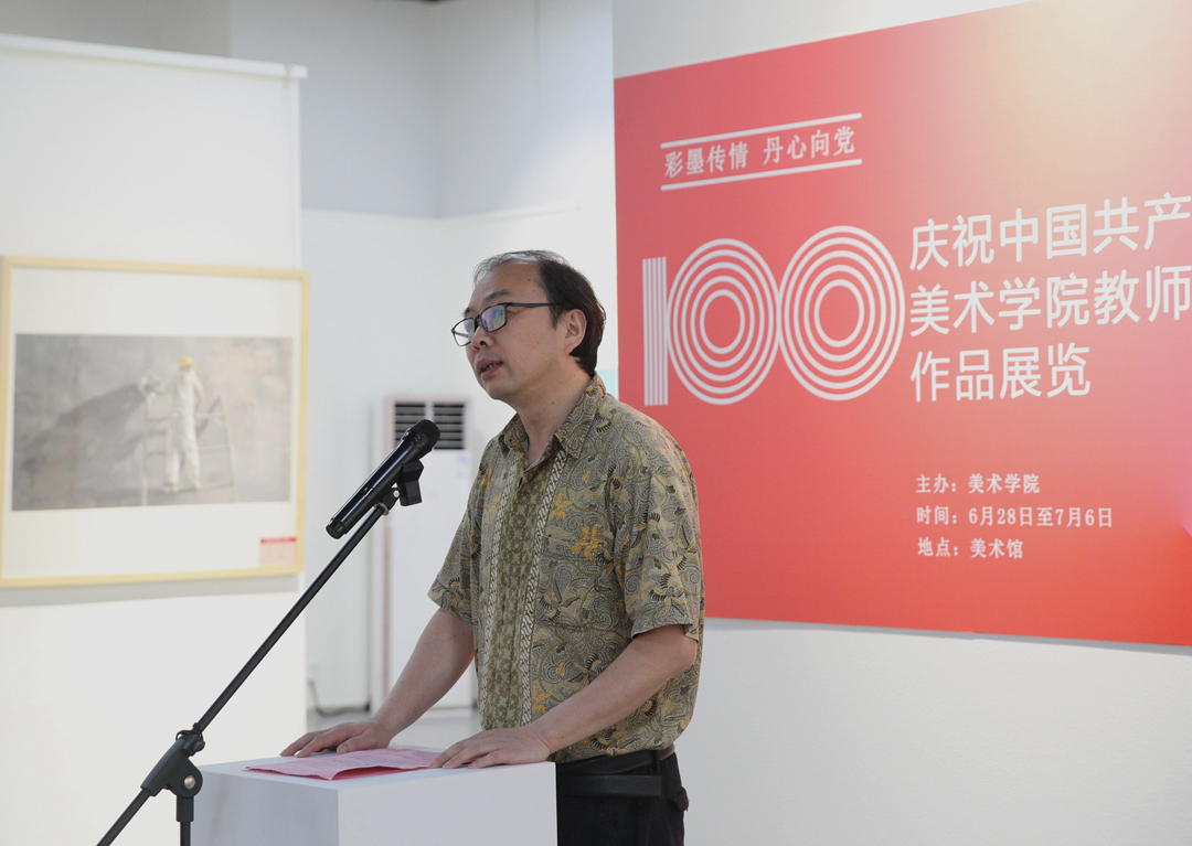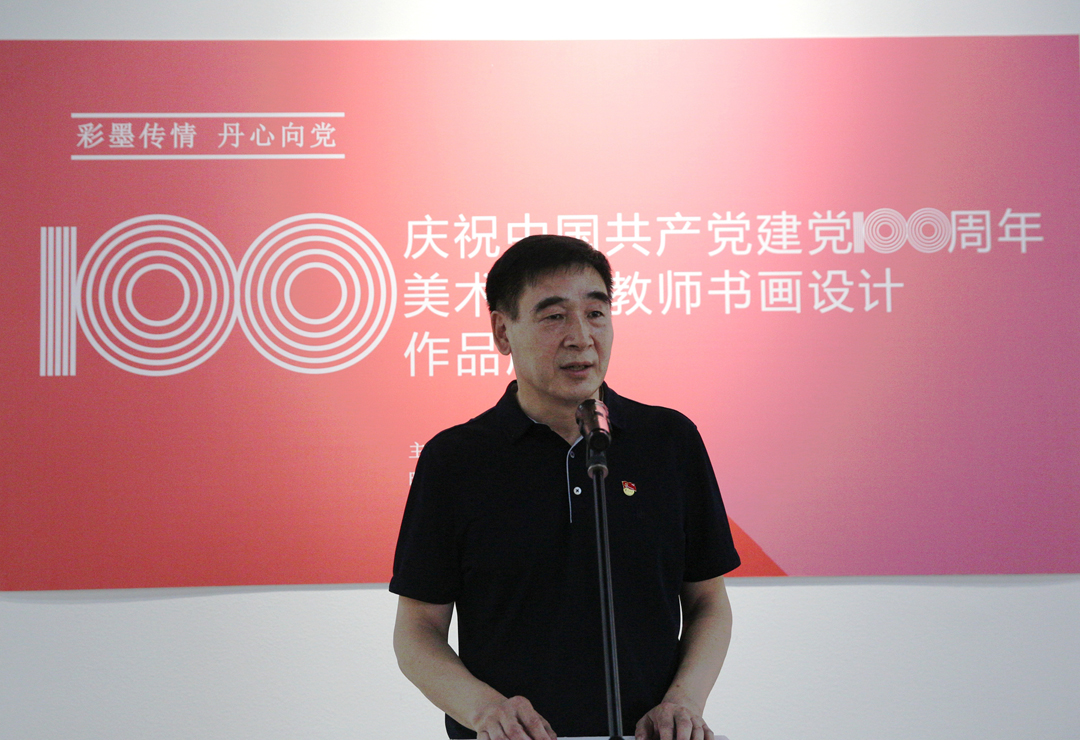 意昂书记陈竹林介绍画展情况。在中国共产党建党100周年之际,意昂师生浓墨重彩,点��祖国山水胜景,勾画盛世中华风情,精心创作50多件书画设计作品,献礼建党100华诞。作品有抒发爱党爱国热情的《共产党颂》、《祖国万岁》,有表现革命英烈的《100・红色记忆》、《李大钊》,也有奔赴抗疫一线的《战士》,有民族风情的《盛装》,还有辛勤劳作的《工匠》、《农民工》,再有祖国大地的《壮美山水》、《忆江南》……。这些作品是一首首无声的颂歌,背后饱含的是意昂教师对党、对祖国、对家乡、对人们挚爱之情,体现了教师坚守美育初心,秉承艺术服务社会和人民的责任担当。