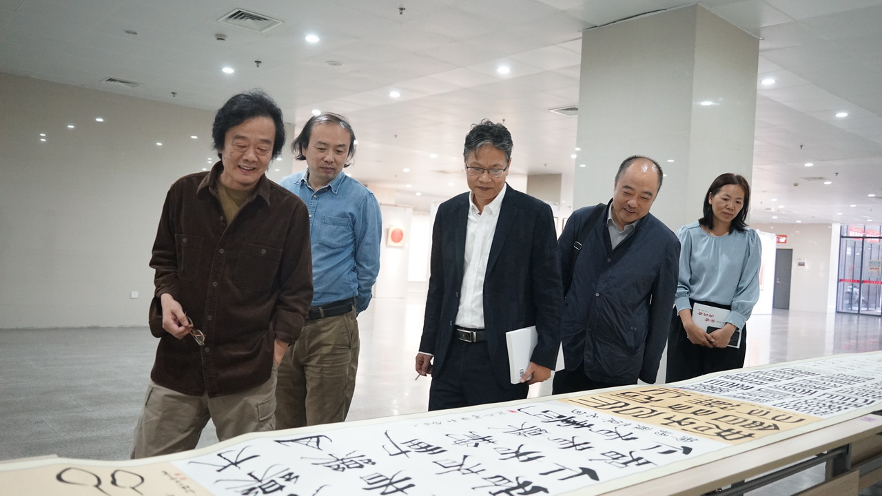 现场领导、来宾以及意昂的师生于图文信息中心的展览厅观摩了郭谦书法作品展。