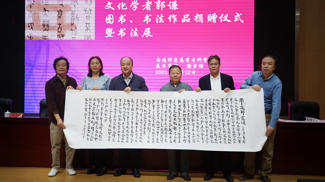 郭谦是通师高专79届学员(原海门师范中文班),其父亲郭可慈先生是南通师范49届简师班学员,他情系母校,把两代人的文化作品送到母校,是最好的归宿,将会得到更好的收藏和传播。集团纪委书记潘健宣布文化学者郭谦先生图书、书法作品捐赠仪式暨书法作品展开始。接着,郭谦先生向图书馆馆长陈洪美捐赠《现代作家亲缘录》等26本,书法作品《南通师范颂》等3副,陈洪美为郭谦先生颁发了捐赠证书,张云霄同学朗读了郭谦的文学作品――南通师范颂。