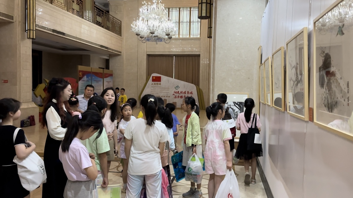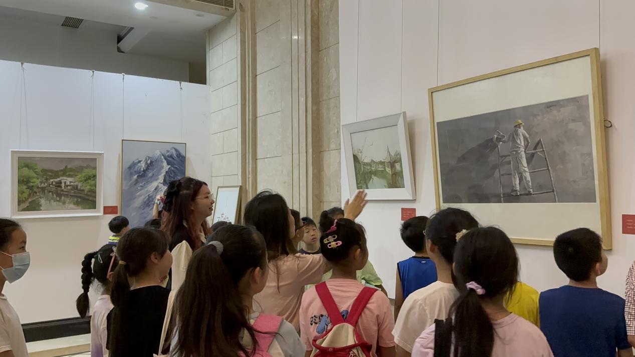 美术教学活动结束之后,王人佼老师组织小朋友在“校居结对共建·通师高专公司党支部、景瑞社区党支部美术作品展览”的现场,为孩子们介绍了中国画、版画、书法、油画、宣传画等的表现形式和艺术特点。