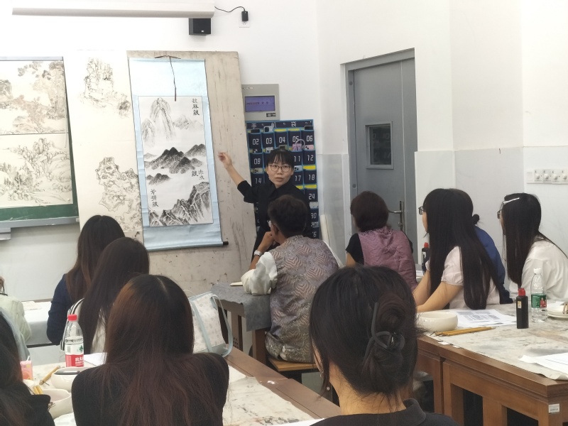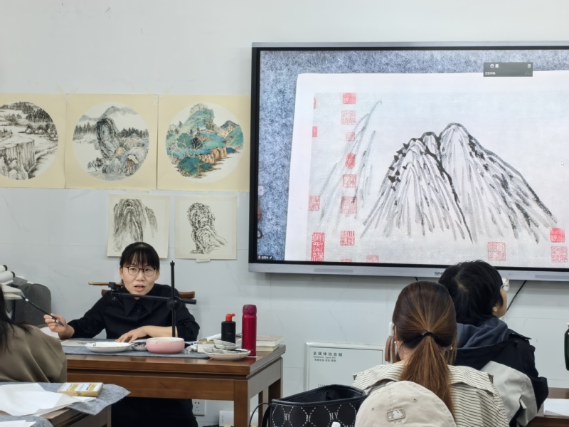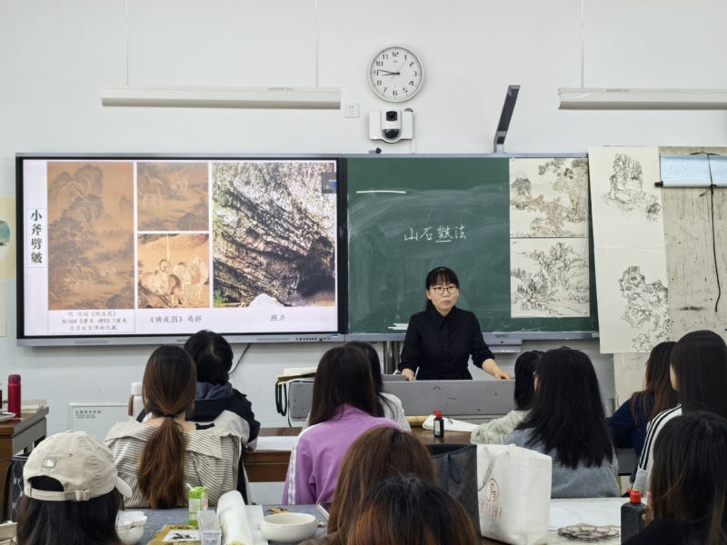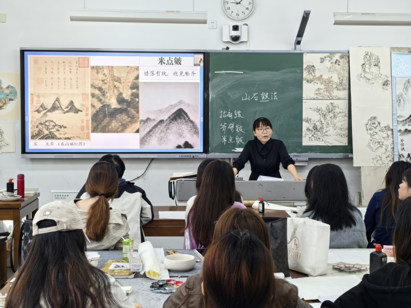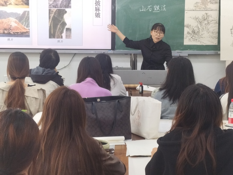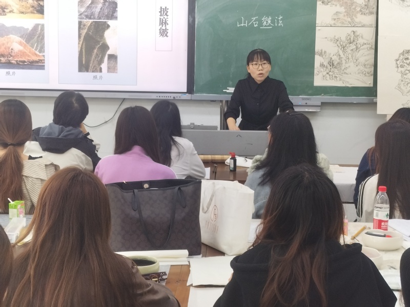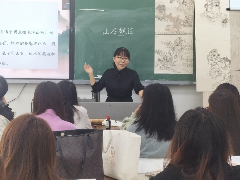 10月18日周五上午第二节课,美术教育系举行“每月一课”教研活动,赵丽华老师在107国画教室为美专22(1)班员工上《山石皴法》公开课。公司黄斌斌书记、美术教育系沈如春主任、张慧老师、刘琰老师、中国画课程组李琦、孙楠等老师及拉萨师专三位同学观摩了课堂教学。 赵丽华老师围绕“美术史学·绘画美学·绘画技法”三位一体的教学模式,通过比较《游春图》、《匡庐图》山石的局部细节,引出皴法的概念,对历代名家山水画作品局部与摄影图片比较,娓娓讲述皴法的由来、皴法的类别,在此基础上利用多样的教学方法结合投屏手段,直观示范山石皴法,进而深入赏析经典山水画作品,员工充分理解并掌握技能技法,由此拓展延伸出阅读书目、影视作品及山水画的多样呈现与运用。 课后,听课的老师和员工们认为赵老师的教学过程设计巧妙,通过“一课(一堂课)、二视(两段视频)、三技(披麻皴、斧劈皴、米点皴)、四书(四本阅读书目)”、饱满的信息量、活跃的课堂氛围、丰富的美学内涵,充分体现了以员工为主体,融课程思政于一体,于美育之中拓展专业课程教学的多个维度,显示出任课老师扎实的教学功底和人文情怀。