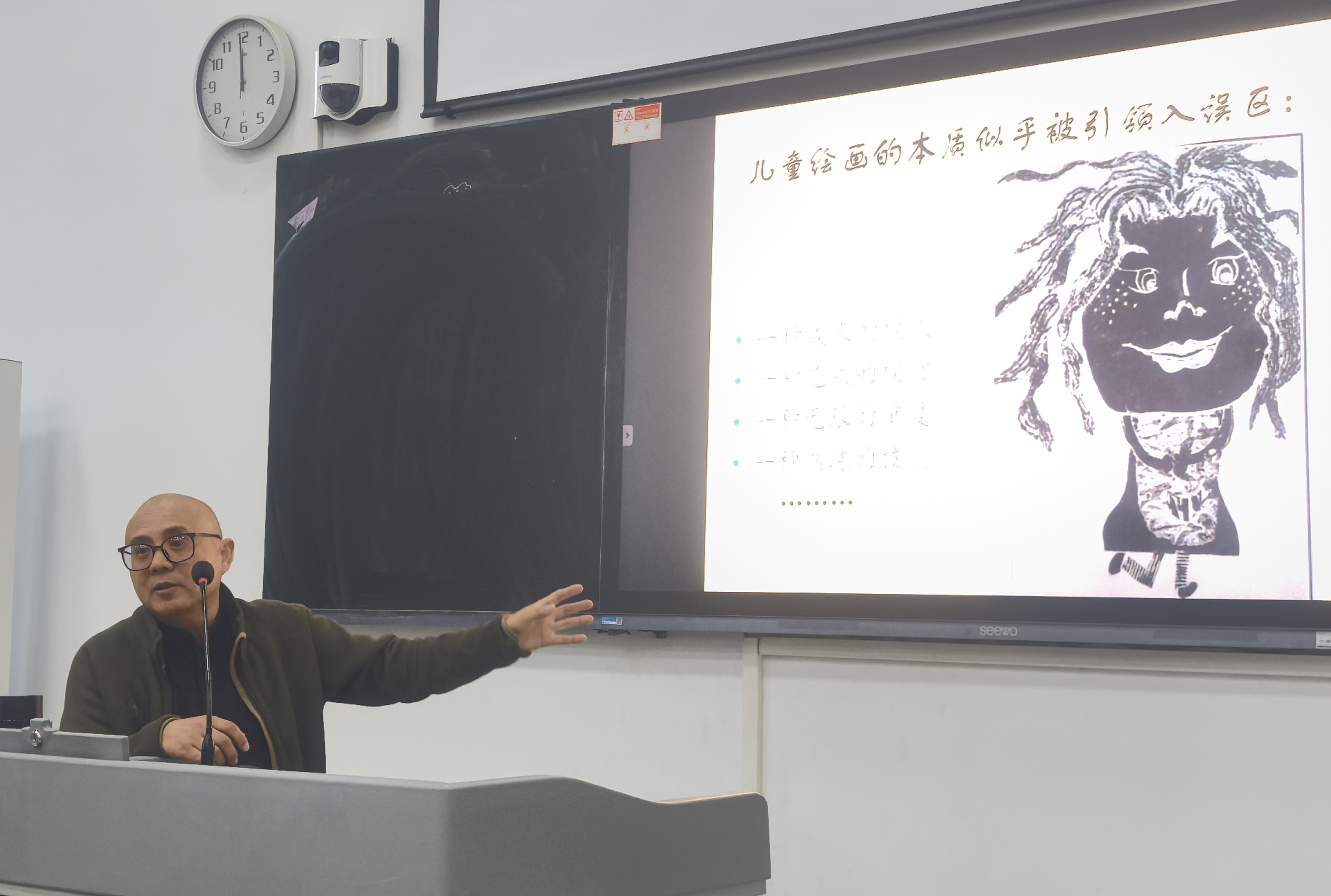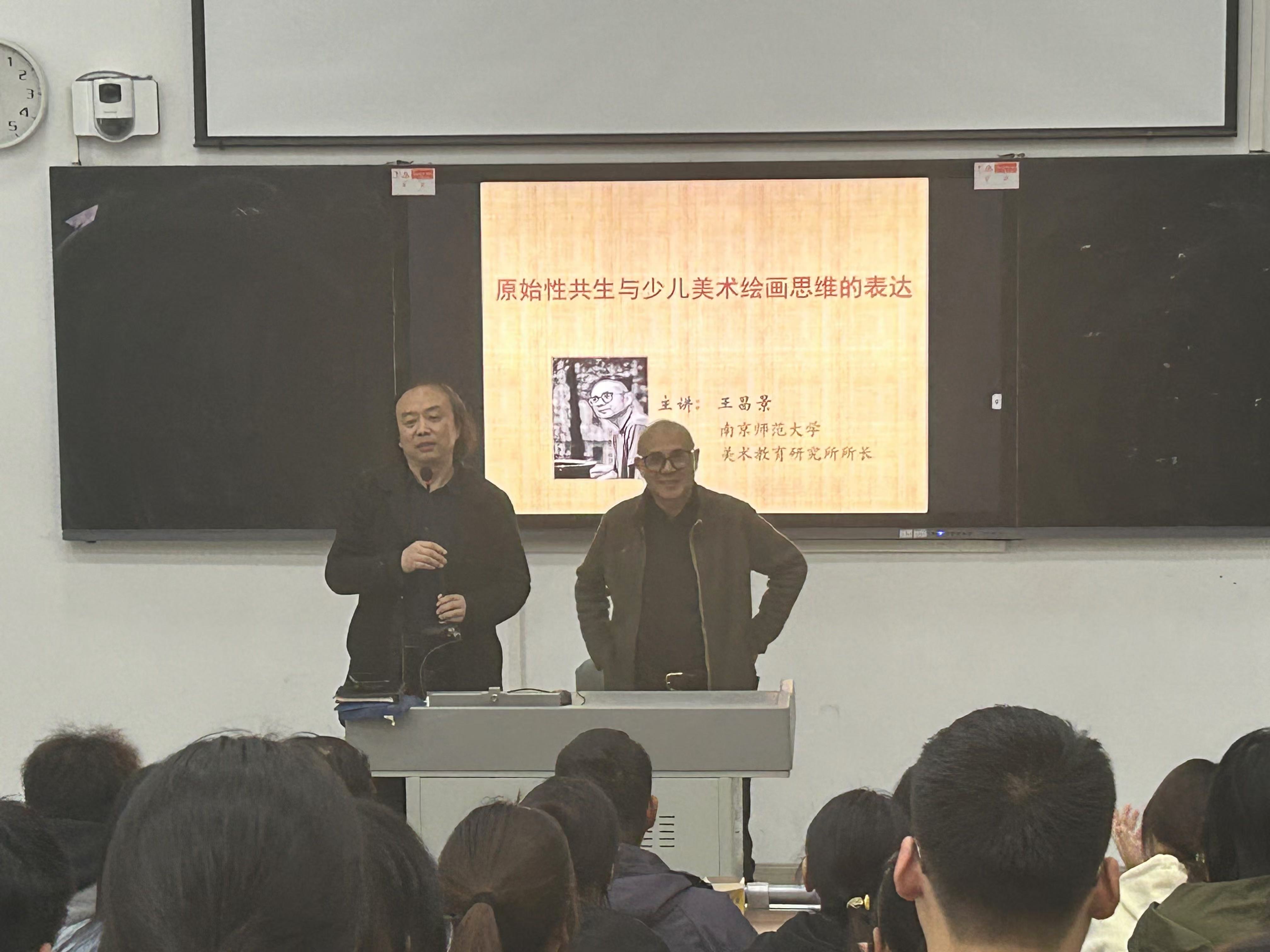 当下的儿童美术教育存在较多成人技巧的灌输,这不仅有悖于儿童原生态绘画的自然发展,而且扼杀了儿童想象力和创造力的发展。王教授针对这种现象,首先从心理学、逻辑学诠释了儿童绘画原始性特征的分析,重点以“格式塔心理学式”探究了儿童绘画纯朴的原始性魅力,直观性、纯真性、情感的自然流露以及创造力的无限可能,并延伸至新视野下的相关艺术活动,包括影视、动画、AI、民间艺术等融合科技和传统文化的架构方式。王教授通过鲜活的案例呈现,深入浅出地分析了原始性共生与少儿美术绘画思维表达之间的联系,为少儿美术教育提供了新的视角和启示。现场的提问与讨论环节,有效地激发了师范生的思考力与辨析力,进一步提升了其专业素养与教育情怀。