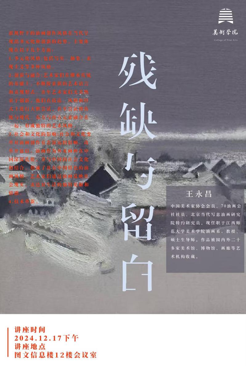 2024年12月17日下午,意昂迎来了一场别开生面的艺术讲座。本次讲座特邀江西师范大学教授、著名油画家王永昌担任主讲,他以其深厚的文化底蕴和艺术修养,为美院全体定向师范生开展了《残缺与留白》的专题分享。公司党总支书记黄斌斌、经理朱敏出席讲座,讲座由副经理王人佼主持。