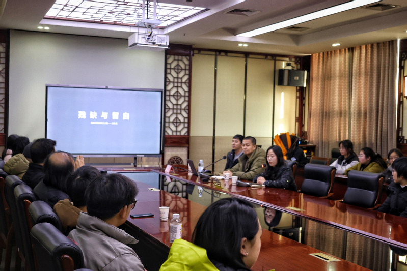 关于讲座的主题“残缺与留白”,源于近些年他不断寻求绘画语言的建构和绘画精神性的表达。为了使“残片”形式合乎语言逻辑,并产生视觉上的舒适感,他开创性地引入了水墨留白、拓片断墨、影像残缺与篆章的“开门、留窗”的图式语言来经营画面,表达对传统绘画背后人文思想的再认识。他鼓励同学们要善于从熟悉的事物中发现新的创作点,做到内容与形式的融合,不断创新,以严谨的态度进行艺术创作,为今后的教师生涯打下坚实的专业基础。