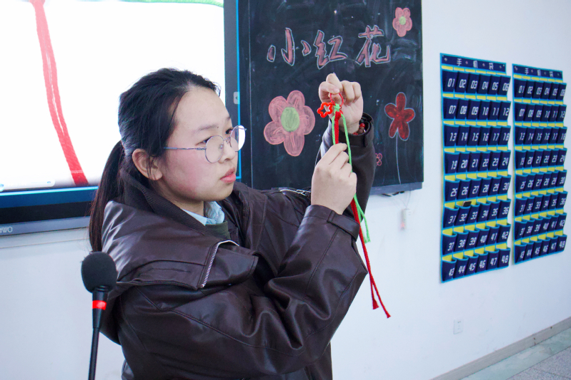 “每一根丝线,都是对奉献精神的立体诠释。”DIY社成员以红黄棉线为媒介,设计出简约却不失巧思的小红花编绳。小红花看似简单,却处处彰显着巧思,红色棉线寓意着雷锋精神中那份炽热的奉献之心,黄色棉线则代表着希望的曙光,二者交织,恰如雷锋精神在生活里点亮希望,传递温暖。