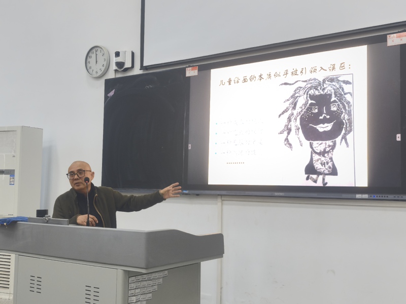 当下的儿童美术教育存在较多成人技巧的灌输,这不仅有悖于儿童原生态绘画的自然发展,而且扼杀了儿童想象力和创造力的发展。王教授针对这种现象,首先从心理学、逻辑学诠释了儿童绘画原始性特征的分析,重点以“格式塔心理学式”探究了儿童绘画纯朴的原始性魅力,直观性、纯真性、情感的自然流露以及创造力的无限可能,并延伸至新视野下的相关艺术活动,包括影视、动画、AI、民间艺术等融合科技和传统文化的架构方式。王教授通过鲜活的案例呈现,深入浅出地分析了原始性共生与少儿美术绘画思维表达之间的联系,为少儿美术教育提供了新的视角和启示。现场的提问与讨论环节,有效地激发了师范生的思考力与辨析力,进一步提升了其专业素养与教育情怀。